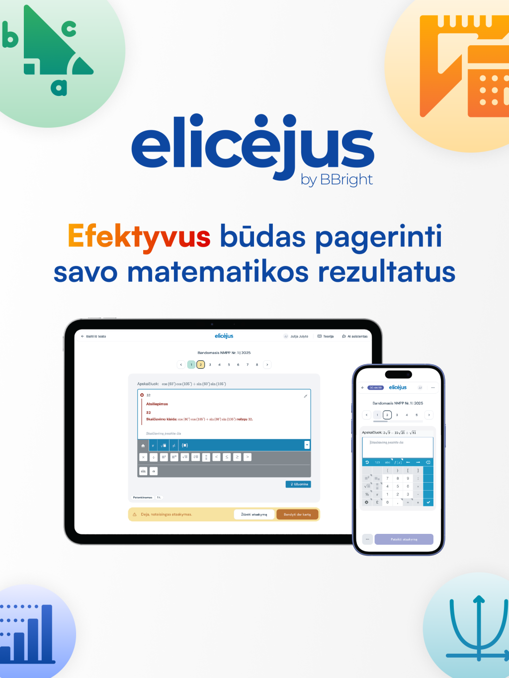 „Elicėjus“ – tai duomenimis grįsta personalizuoto mokymosi platforma, skirta 5–8 klasių bei I–IV gimnazijos klasių matematikos mokymuisi. Ši inovatyvi skaitmeninė priemonė padeda tiek mokiniams, tiek mokytojams pasiekti tikslingesnį ir efektyvesnį mokymosi procesą, pritaikytą individualiems poreikiams bei realiam žinių lygiui. Platformoje integruotas diagnostinių testų modulis leidžia tiksliai įvertinti mokinio pasiekimų lygmenį ir numatyti optimalų mokymosi kelią. Remdamasi šiais duomenimis, sistema automatiškai formuoja personalizuotas užduočių sekas, kurios padeda stiprinti žinių spragas, gilinti supratimą ir kurti tvirtą pagrindą pažangai. Be individualaus mokymosi, platforma taip pat siūlo sprendimus visai klasei ar net visai mokyklai: