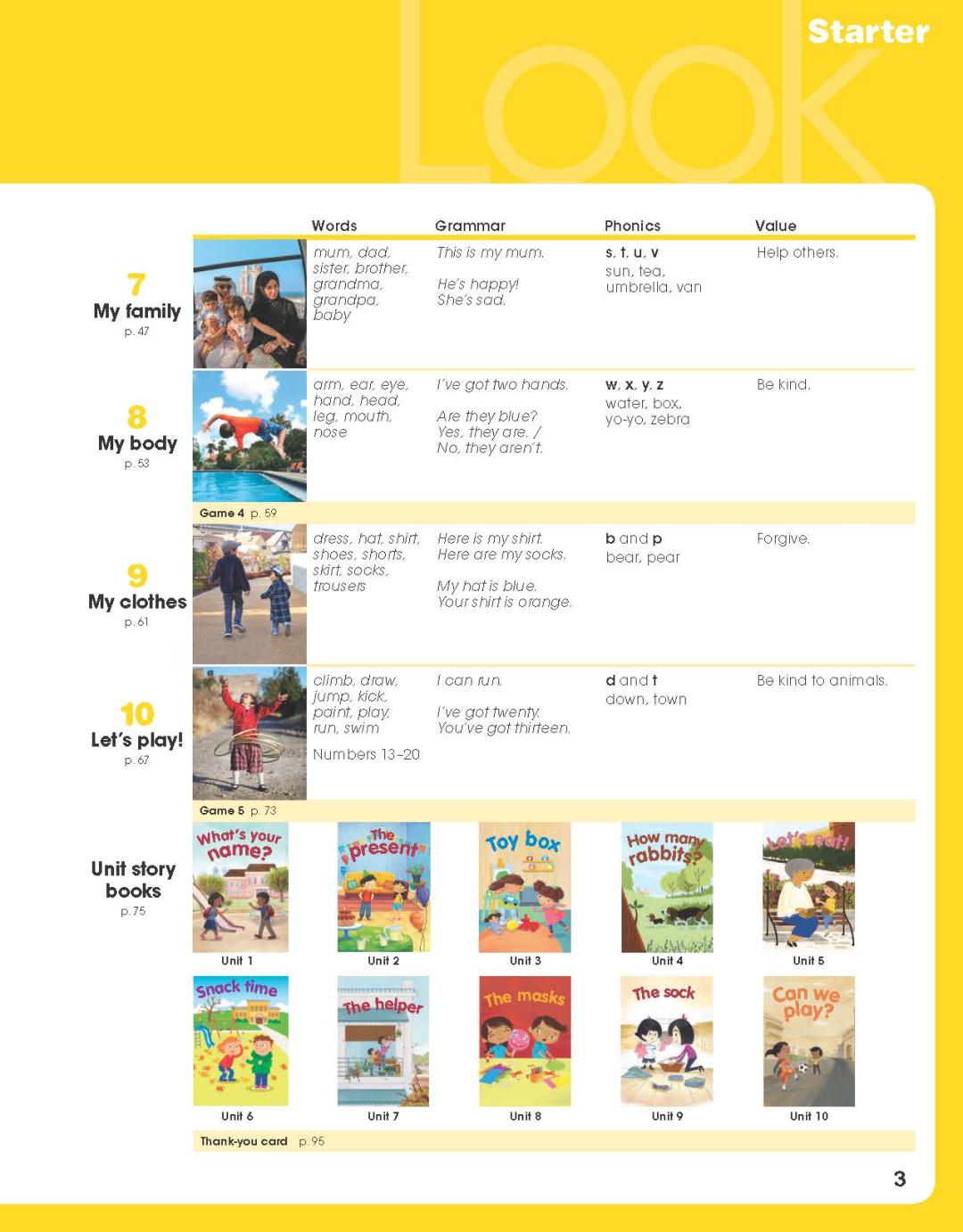 Kiekvienas Look STARTER vadovėlio skyrius parengtas taip, kad mokiniai mokydamiesi anglų kalbos lavintų kritinį mąstymą, atrastų sąsajų su juos supančia aplinka. Vadovėlis paremtas žaidybinėmis, vaidybinėmis, kūrybiškumą skatinančiomis užduotimis. Knygoje gausu nuotraukų iš National Geographic archyvų, skirtų įtraukti ir supažindinti mokinius su pasaulio reiškiniais, objektais, tokiu būdu įvedant į pagrindinę skyriaus temą. Mokytojo knygoje pateikti išsamūs įvadinių nuotraukų aprašymai, pateikiama rekomendacijų, kaip nagrinėti iliustracijas ir atskleisti temas. Didžioji dalis užduočių siejamos su klausymu ir girdimos informacijos supratimu. Kiekviena užduotis paremta iliustracijomis – žodynas pateikiamas per realias objektų nuotraukas, gramatinės struktūros iliustruotos piešiniais, pristatomos dainose, per pavyzdžius, supažindinama su anglų kalbos raidynu, mokoma rašymo krypties (jungiant taškus iš kairės į dešinę, iš apačios į viršų, iš viršaus į apačią).