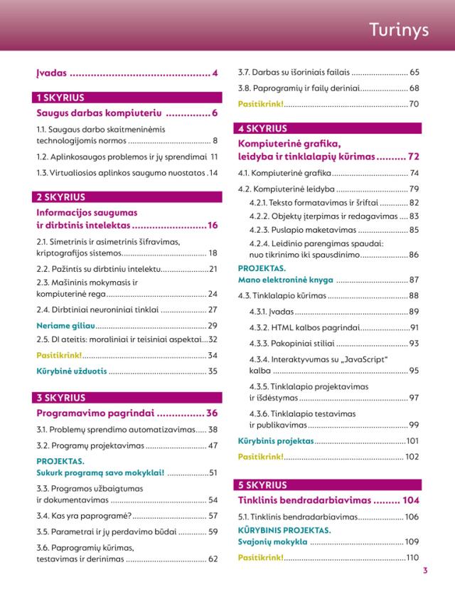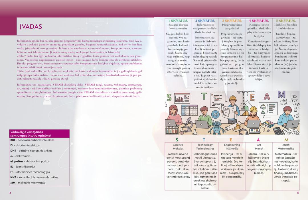 Vadovėlis išsiskiria vizualiai turtingu turiniu: kruopščiai parengtos schemos, aukštos kokybės iliustracijos ir koncentruotos infografikos padeda mokiniams lengviau įsisavinti net ir sudėtingiausius informatikos principus. Praktiniai realaus gyvenimo pavyzdžiai ir stimuliuojančios užduotys ne tik sustiprina programavimo įgūdžius, bet ir atveria platesnį informacinių technologijų pasaulį, demonstruodamos jų universalumą ir galimą poveikį ateities profesijoms. Vadovėlis siekia ne tik suteikti žinių, bet ir įkvėpti mokinius tapti aktyviais ir kūrybingais technologijų vartotojais bei kūrėjais.