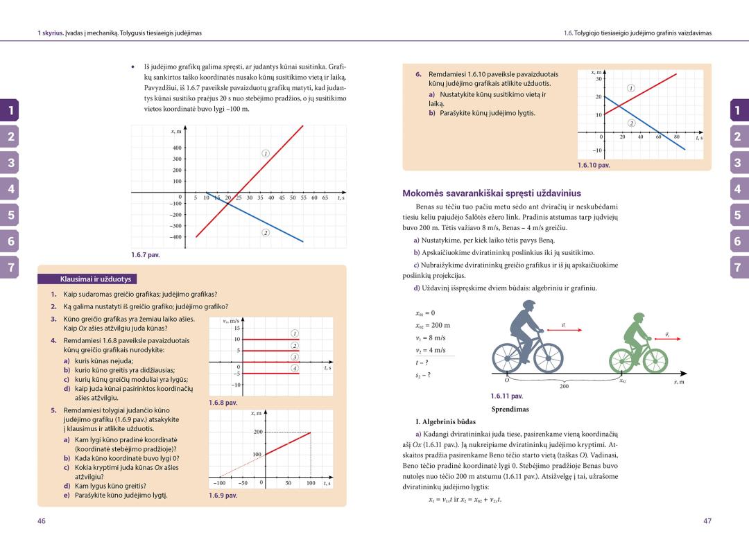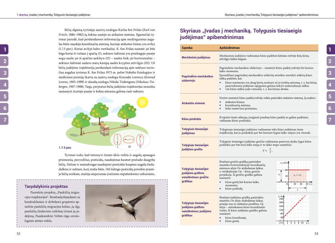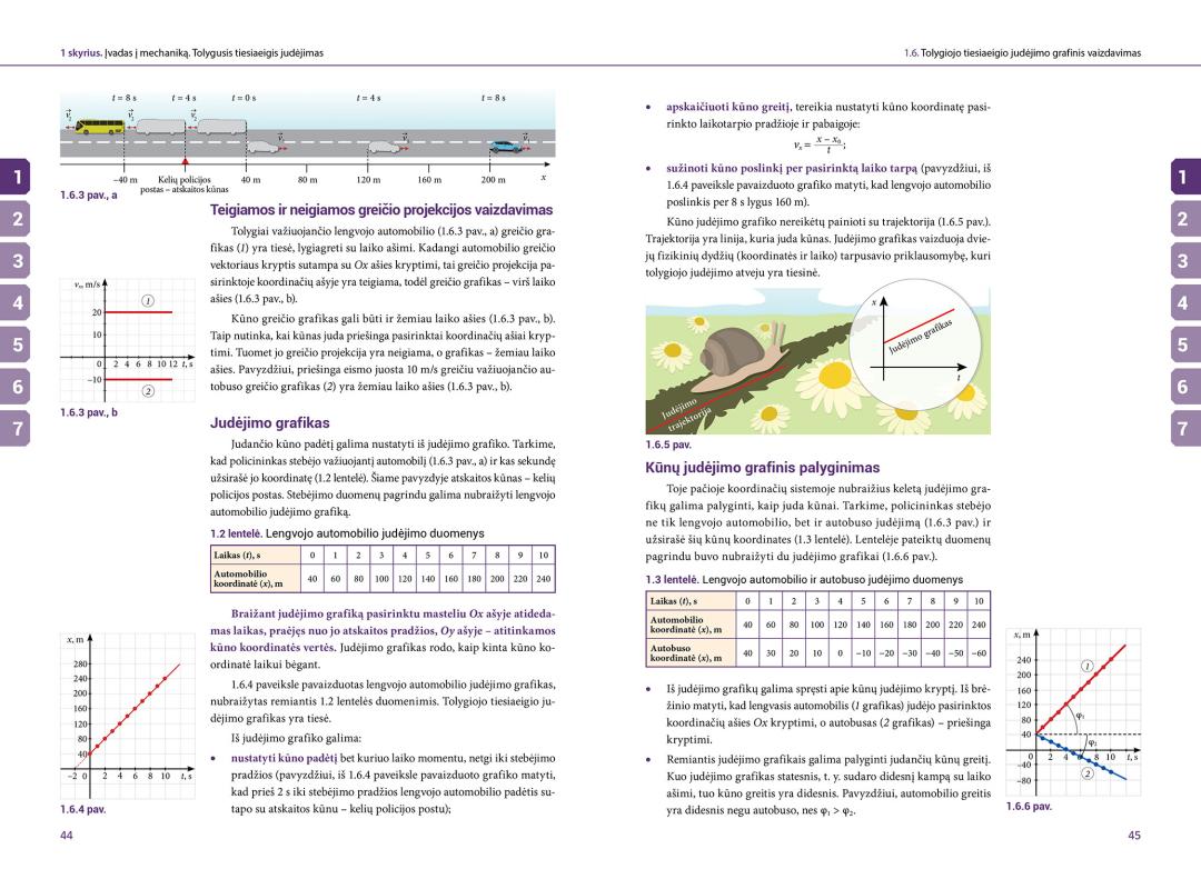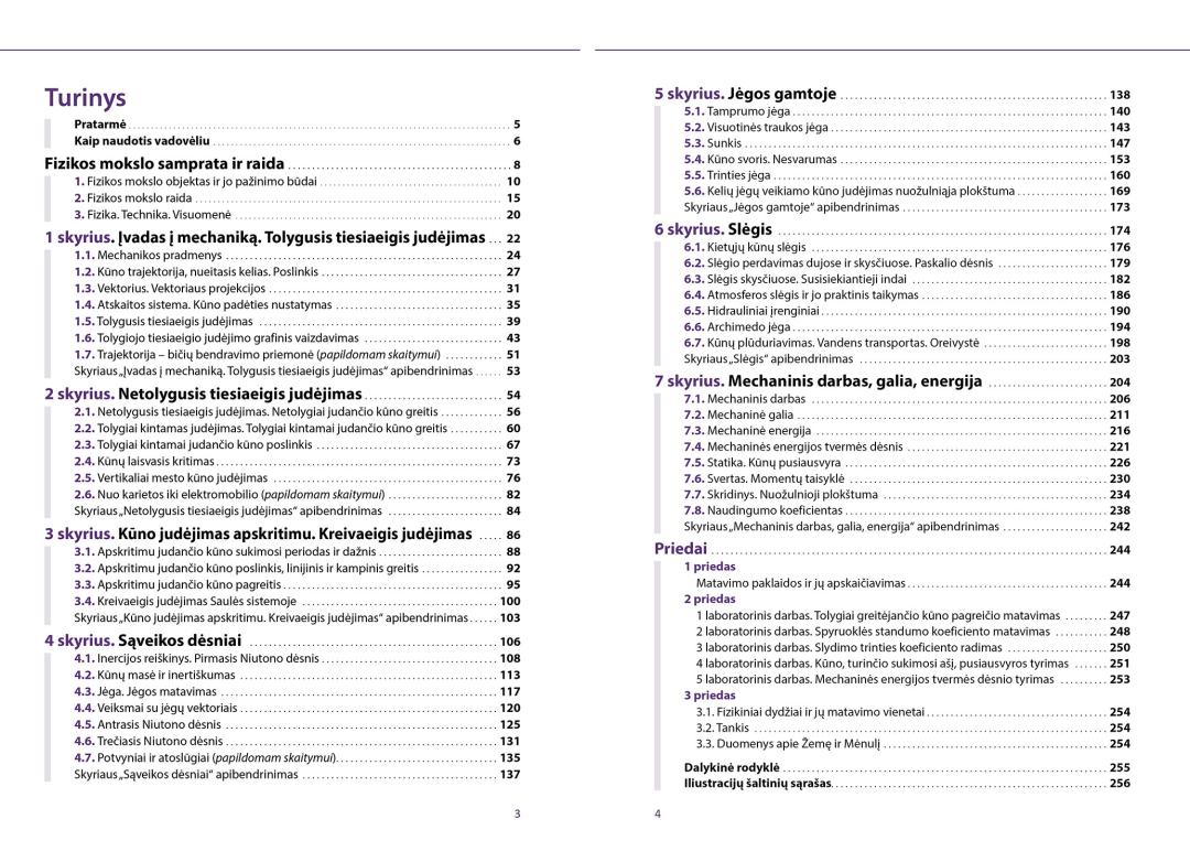 Vadovėlį sudaro septyni skyriai: „Tolygusis tiesiaeigis judėjimas“, „Netolygusis judėjimas“, „Kūno judėjimas apskritimu. Kreivaeigis judėjimas“, „Judėjimo dėsniai“, „Jėgos gamtoje“, „Slėgis“, „Mechaninis darbas, galia, energija“. Kiekvienas skyrius pradedamas trumpa anotacija, o baigiamas santrauka. Tai supaprastina kartojimą, padeda įsivertinti žinias ir supratimą.
