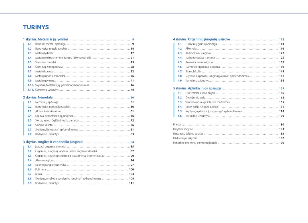 Vadovėlį sudaro 5 skyriai: „Metalai ir jų lydiniai“, „Nemetalai“, „Anglies ir vandenilio junginiai“, „Organinių junginių įvairovė“, „Aplinka ir jos apsauga“.