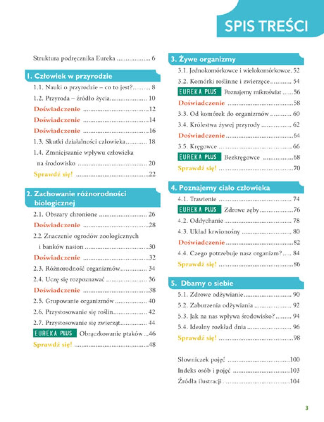 Vadovėlį sudaro: skyriaus įvadas, pagrindinė tema, „Eureka Plius“, rubrika „Pabandyk!“ ir „Žinių patikrinimas“. „Eureka Plius“ – papildomos temos, skirtos žinioms pagilinti ir akiračiui praplėsti. Rubrika „Pabandyk!“ siūlo mokiniams praktiškai pritaikyti įsisavintas žinias ir atlikti įdomius bandymus. Kiekvieno skyriaus pabaigoje pateiktas „Žinių patikrinimas“, skirtas mokinių gebėjimams vertinti.