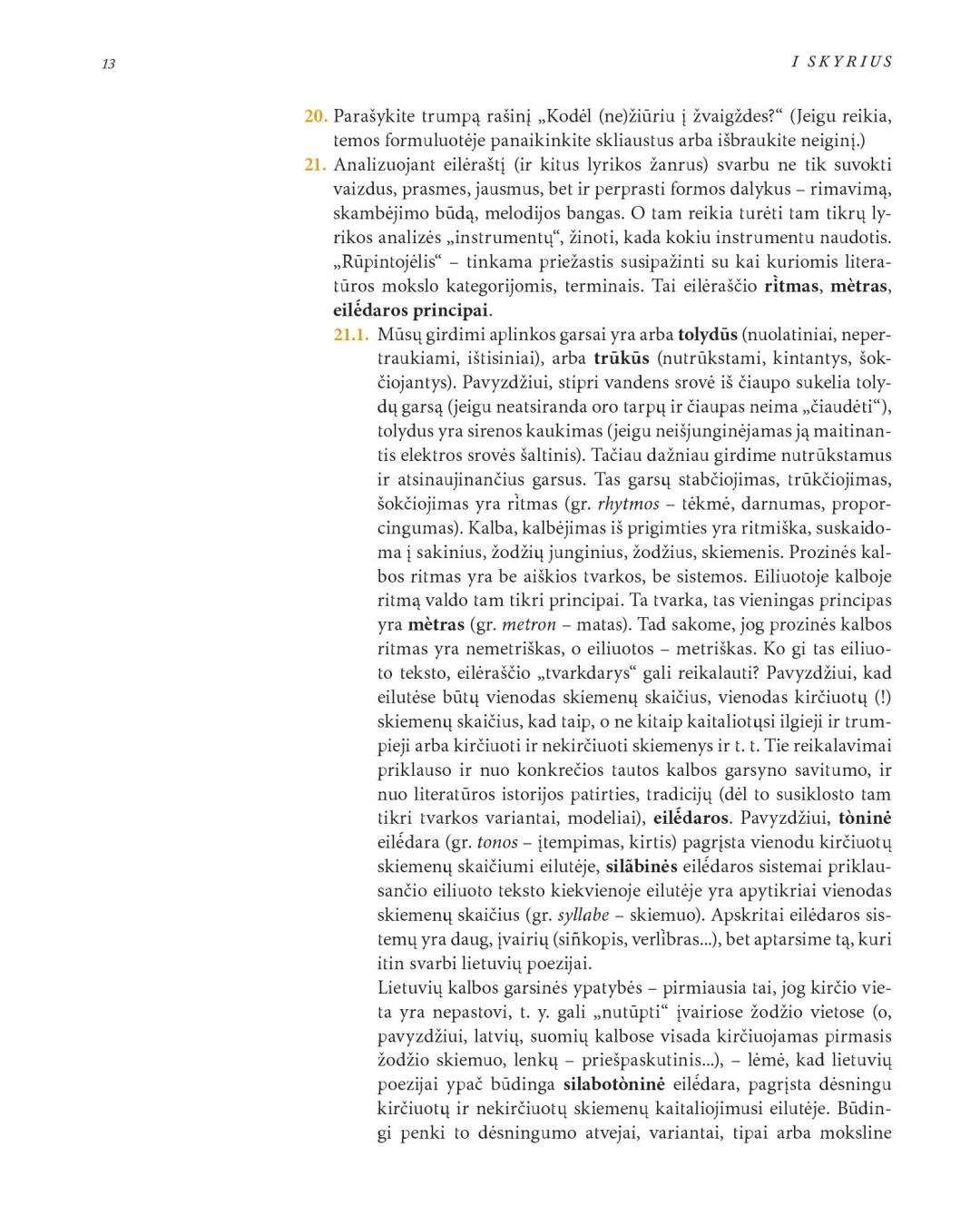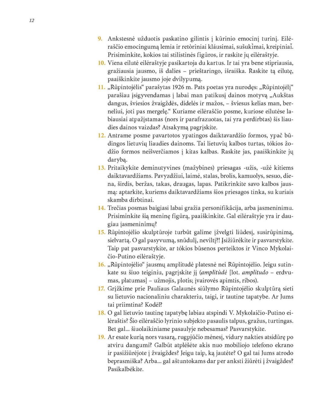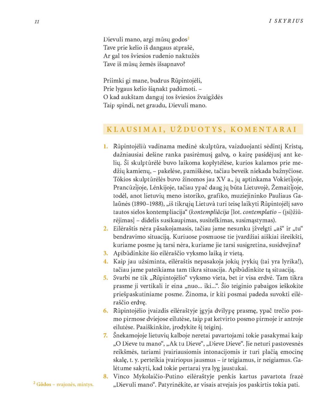 Klausimai ir užduotys padės mokyti atidžiojo skaitymo, suvokti kūrinio prasmę ir niuansus, meninius bruožus, gilintis į literatūros teoriją, skatins svarstyti, diskutuoti, sieti skirtingus kūrinius, ugdys interpretacinius gebėjimus, kritinio mąstymo ir kitas kompetencijas. Kiekvienas skyrius baigiamas apibendrinimo, kartojimo klausimais ir kūrybinėmis užduotimis.
