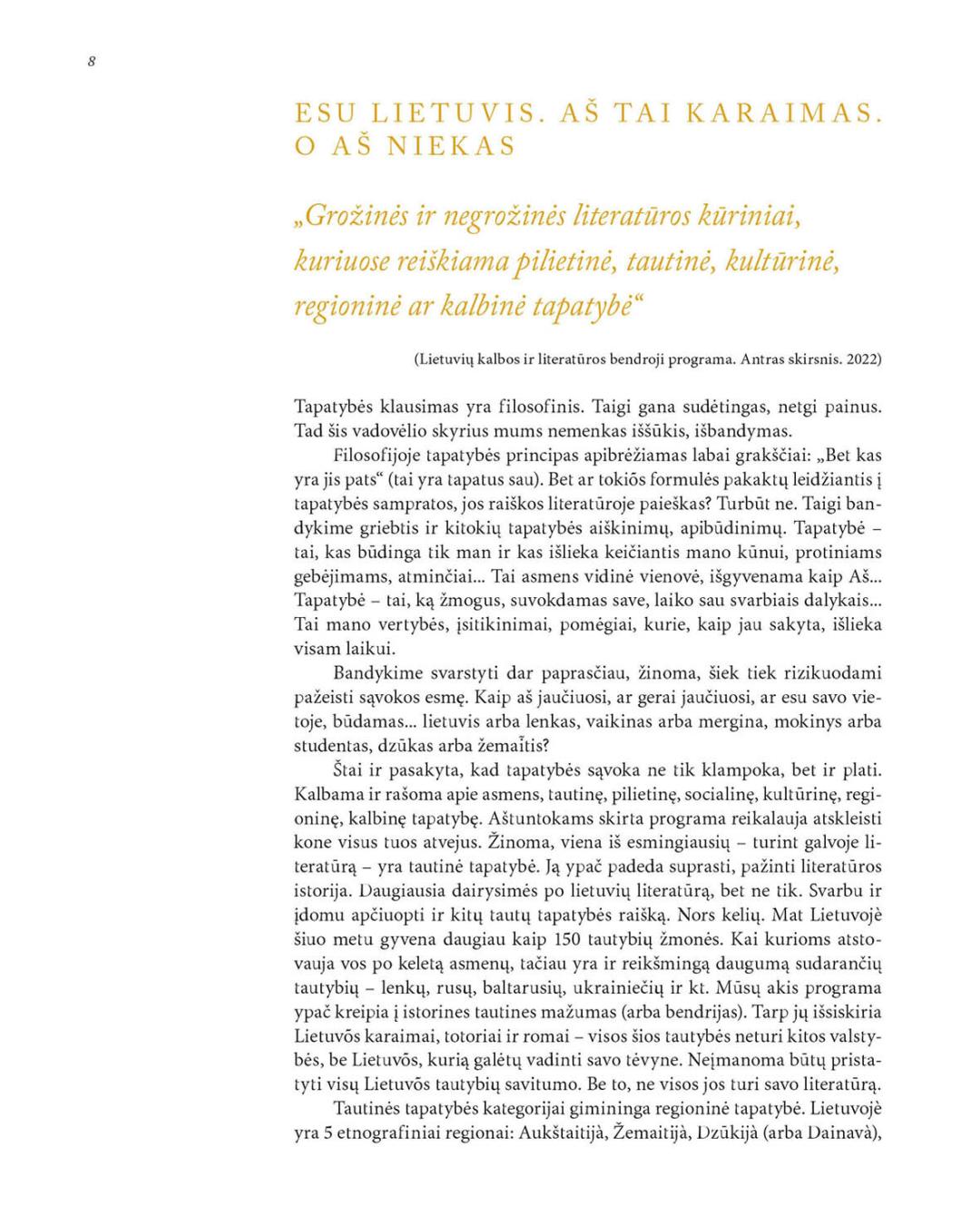 Antrą vadovėlio dalį sudaro 3 skyriai. Pirmame nagrinėjama pilietinė, tautinė, kultūrinė, kalbinė, regioninė tapatybė grožinės ir negrožinės literatūros kūriniuose. Antro skyriaus literatūros kūriniuose svarstomi moraliniai klausimai, laikysena ribinėse situacijose. O trečiame apžvelgiama Lietuvai ir pasauliui svarbių kūrėjų – Mikalojaus Konstantino Čiurlionio, Anos Frank, Aldonos Liobytės ir kitų – egodokumentika.