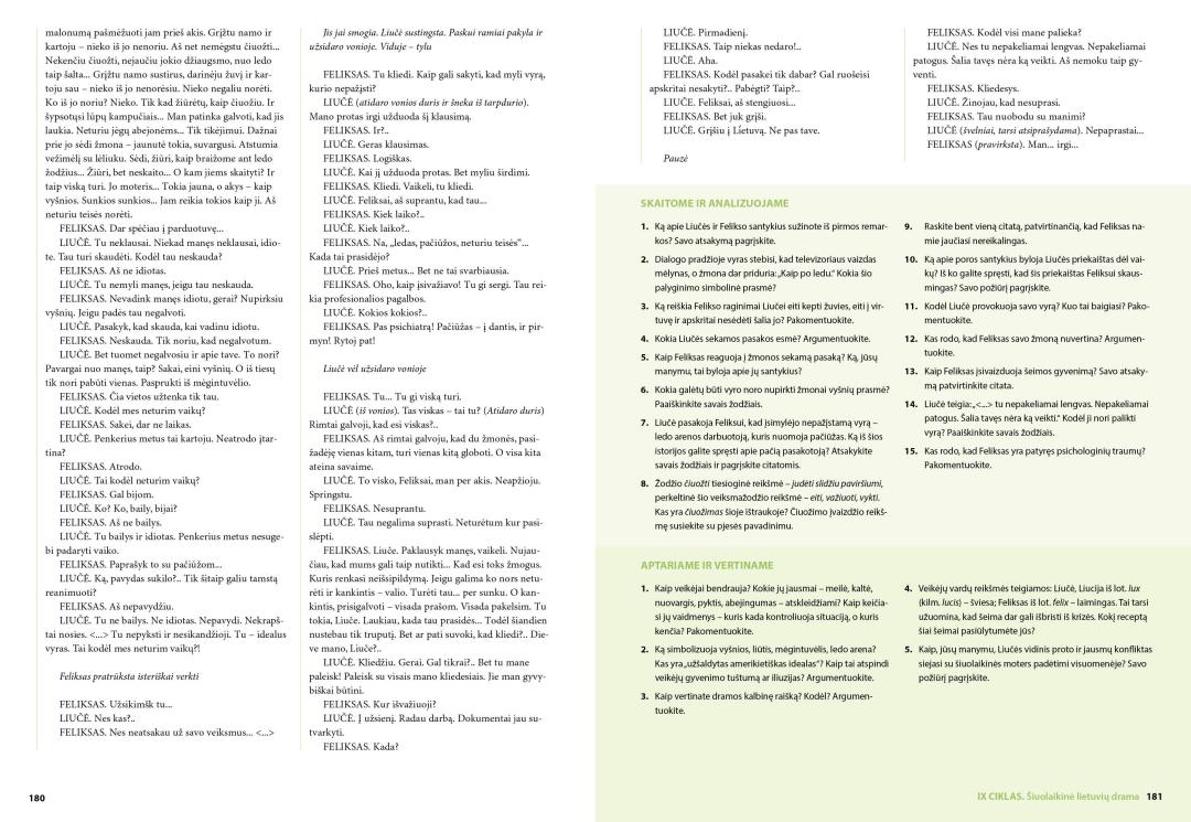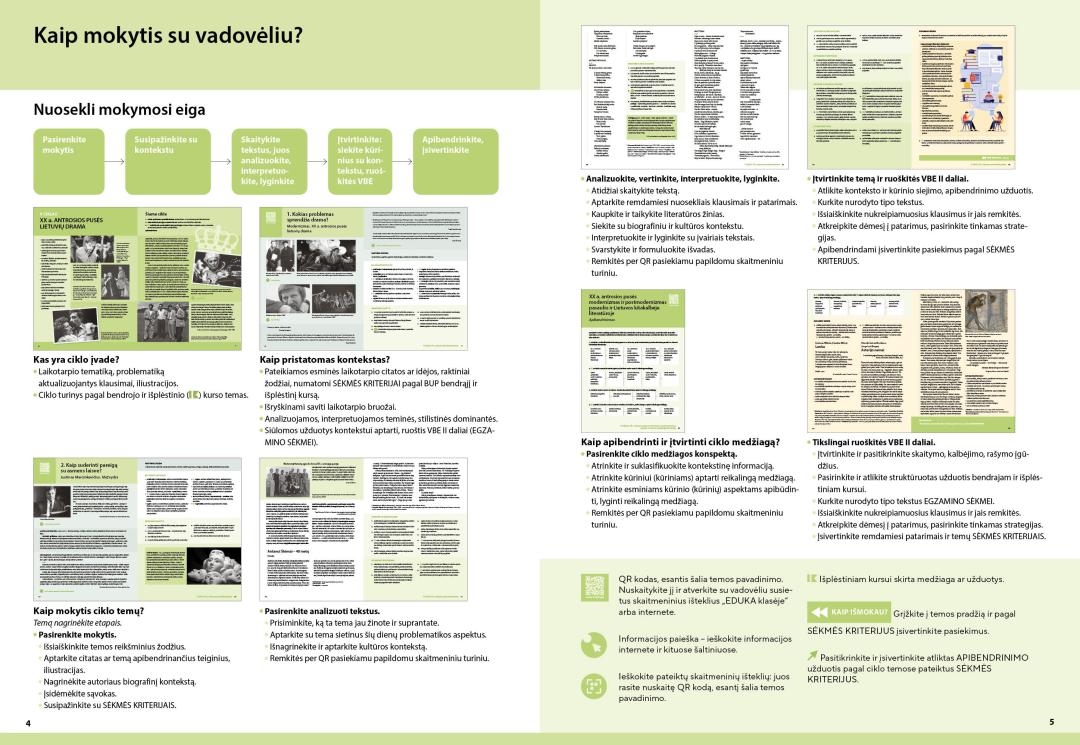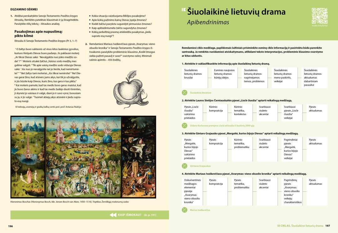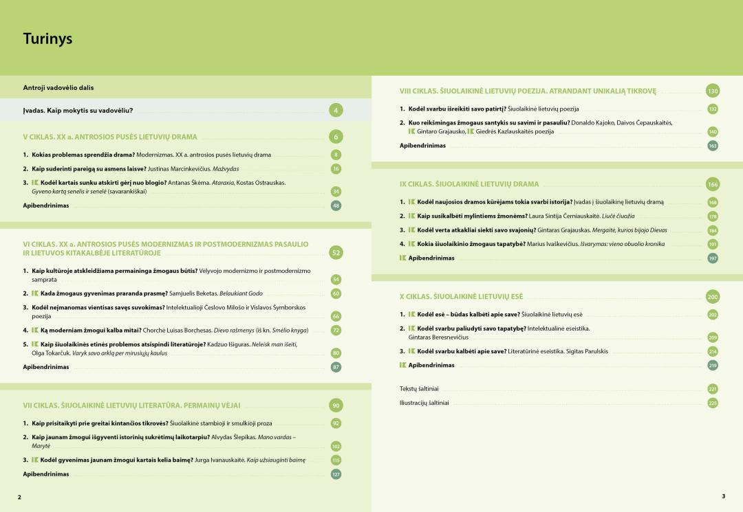 - Ciklo temose – klausimus ir užduotis publicistinių, literatūros kritikos, privalomųjų ir konteksto kūrinių skaitymui ir analizei, užduotis interpretacijai, lyginimui, vertinimui; įtvirtinimo dalyje – užduotis konteksto ir kūrinio siejimui, teksto kūrimui, rubrikas „Egzamino sėkmei“;