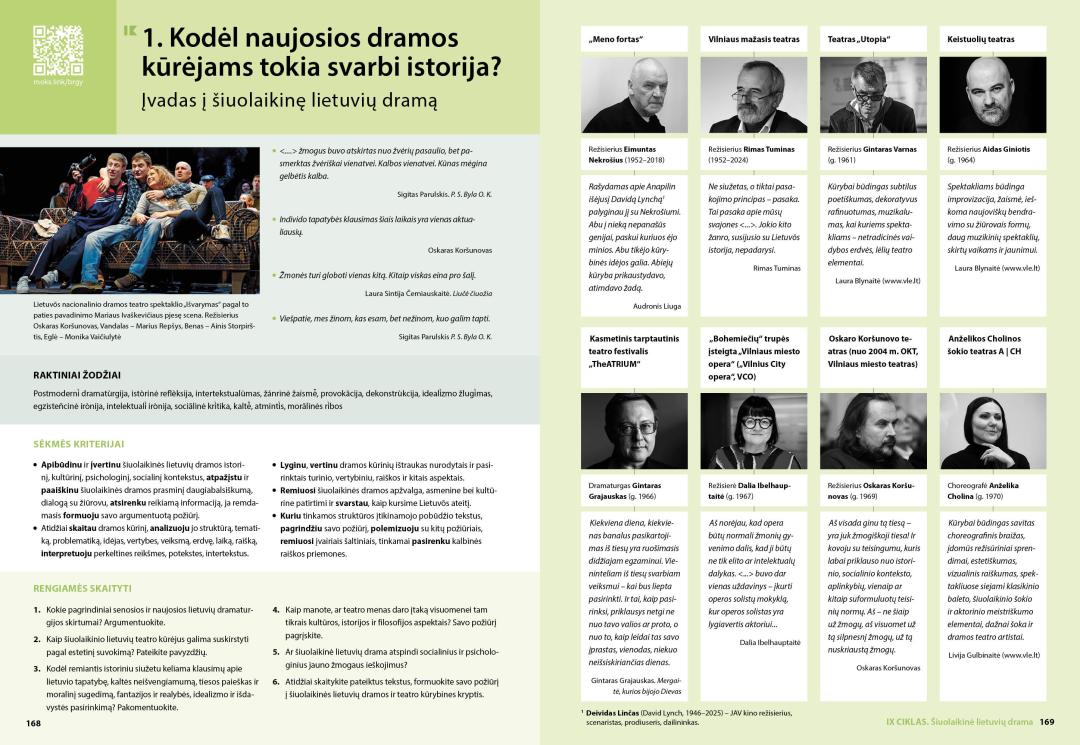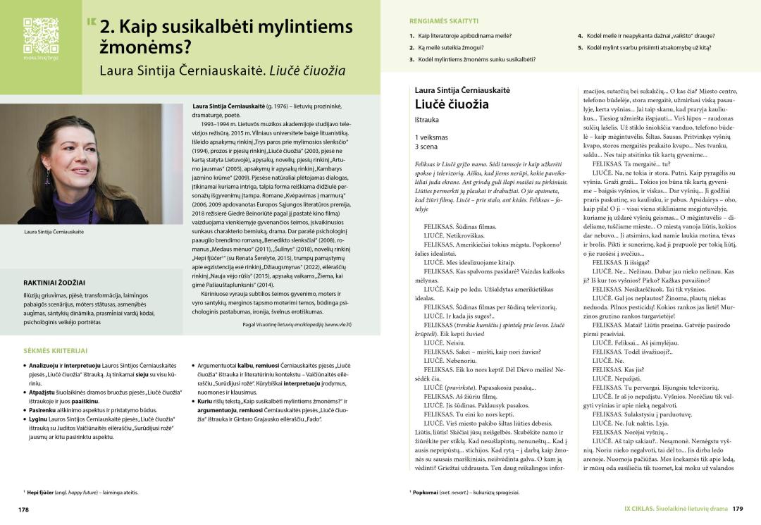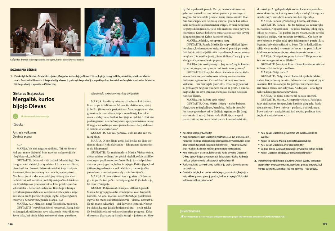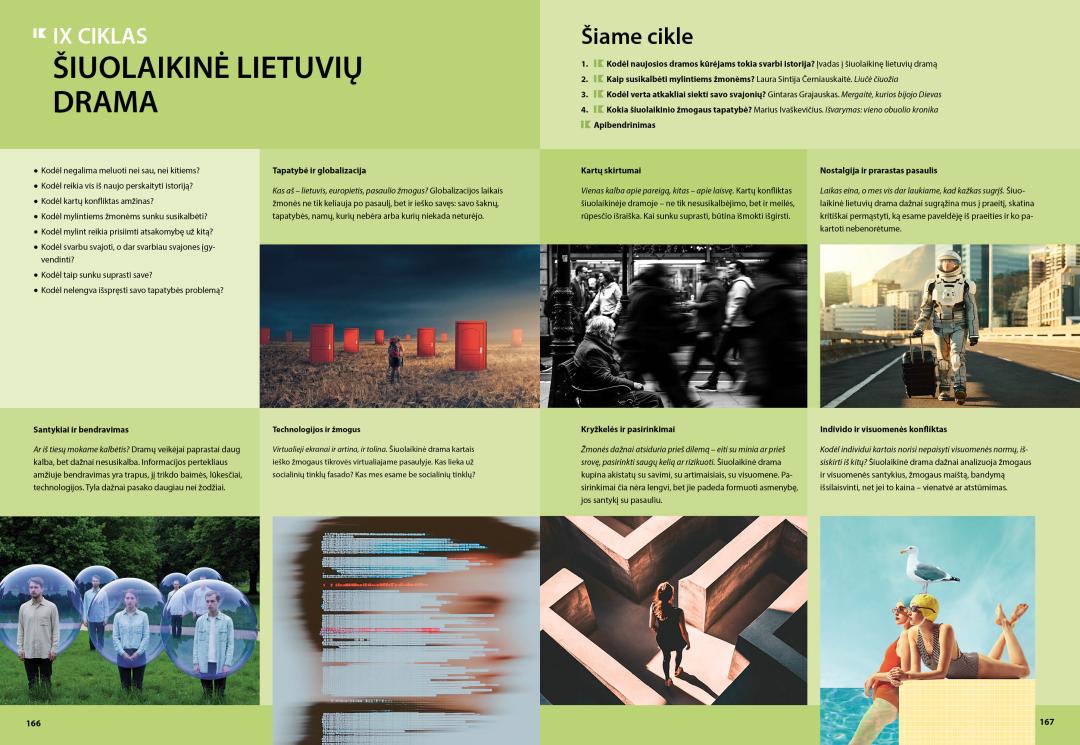 - Ciklo temose – klausimus ir užduotis publicistinių, literatūros kritikos, privalomųjų ir konteksto kūrinių skaitymui ir analizei, užduotis interpretacijai, lyginimui, vertinimui; įtvirtinimo dalyje – užduotis konteksto ir kūrinio siejimui, teksto kūrimui, rubrikas „Egzamino sėkmei“;