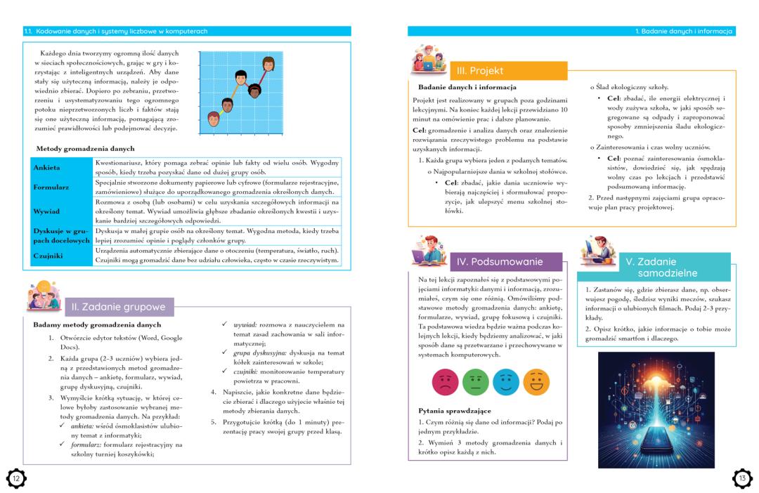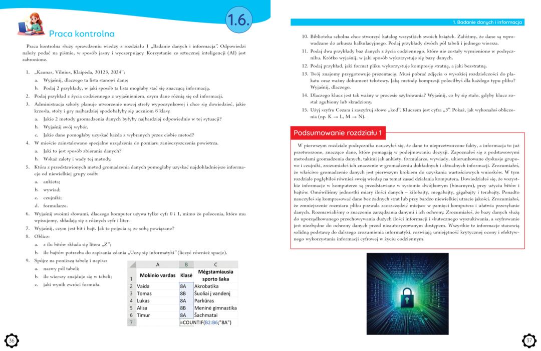 Vadovėlis išsamiai nagrinėja duomenų tyrybą ir informacijos valdymą, apimdamas duomenų kodavimą, sąryšių tyrinėjimą, glaudinimą ir šifravimo metodus. Papildomai mokiniai susipažins su kompiuterio techninės ir programinės įrangos sandara, tinklų veikimo principais ir interneto technologijomis, tarp jų – HTML ir CSS. Praktinės užduotys ir įtraukiantys projektai sustiprins programavimo ir duomenų analizės įgūdžius, pagilins informatikos pagrindus.