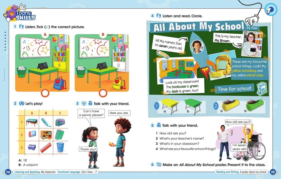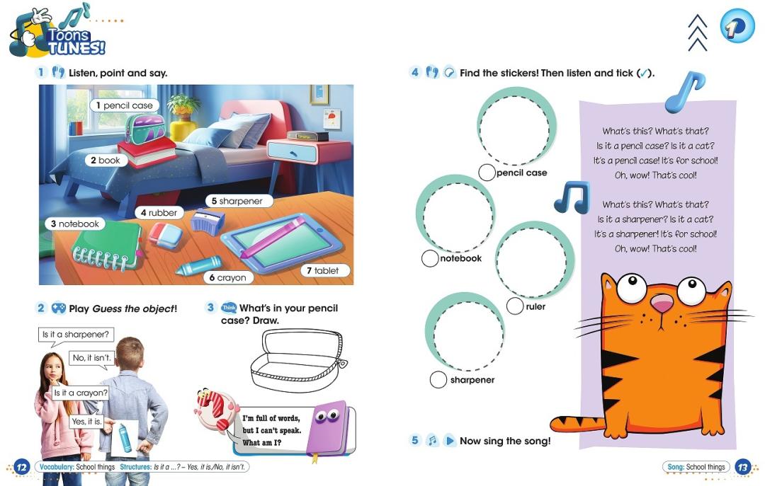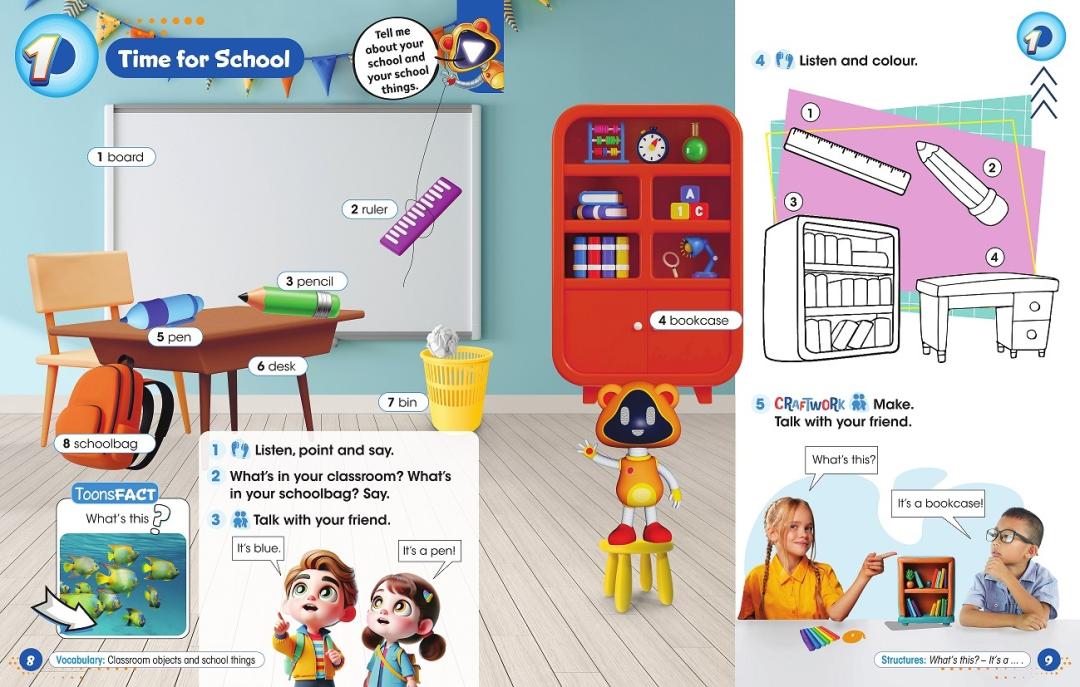 Vadovėlis „Happy Toons 1“ orientuotas į A1 (pradedantysis) kalbos mokėjimo lygį ir gali būti naudojamas pradinio ugdymo 1-oje arba 2-oje klasėje (1-ieji mokymo metai): mokinys išmoksta skaityti ir rašyti, taisyklingai tarti žodžius; užduoda lengvus klausimus ir trumpai atsako į juos, sudaro paprastą sakinių struktūrą. Vadovėlis tinkamas ugdyti besimokančiuosius pagal atnaujintas Bendrąsias programas. Vadovėlyje apimta visa atnaujinto BP numatyta tematika (pvz., šeima, draugai, laisvalaikis, mokykla), kompetencijų ugdymas, komunikacinės intencijos ir kiti turinio aspektai.
