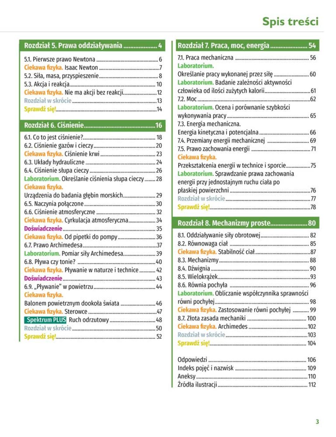Pagrindines vadovėlio temas papildo įtraukiančios „Spektras plus‘‘ temos, skirtos padengti 30 % mokytojo laisvai pasirenkamo fizikos ugdymo turinio. Kiekvienas skyrius baigiamas „Santrauka“, kurioje apibendrinama išeita medžiaga, o žinias ir gebėjimus siūloma įsivertinti rubrikoje „Pasitikrink“.