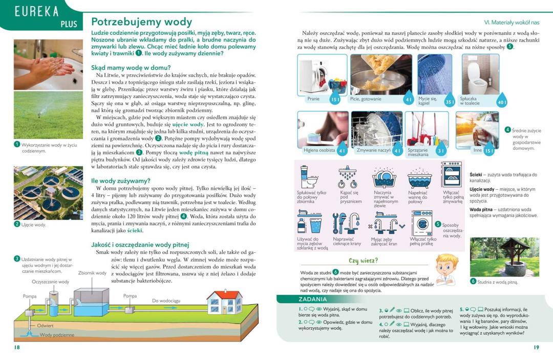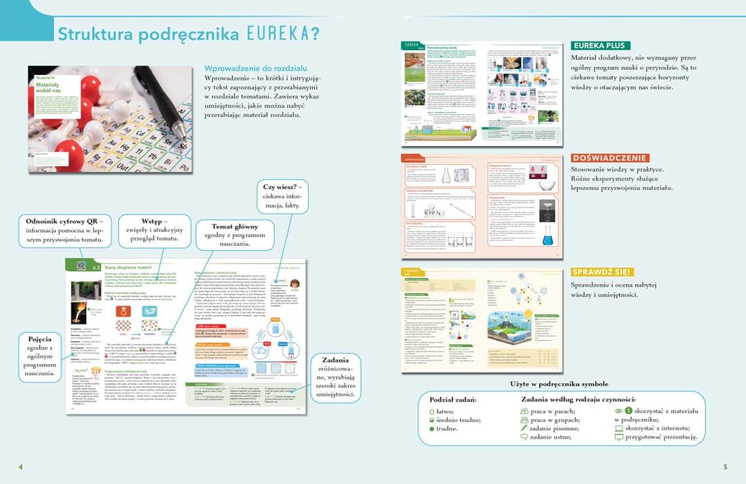 Vadovėlį sudaro: skyriaus įvadas, pagrindinė tema, „Eureka Plius“, rubrika „Pabandyk!“ ir „Žinių patikrinimas“. „Eureka Plius“ – papildomos temos, skirtos žinioms pagilinti ir akiračiui praplėsti. Rubrika „Pabandyk!“ siūlo mokiniams praktiškai pritaikyti įsisavintas žinias ir atlikti įdomius bandymus. Kiekvieno skyriaus pabaigoje pateiktas „Žinių patikrinimas“, skirtas mokinių gebėjimams vertinti.