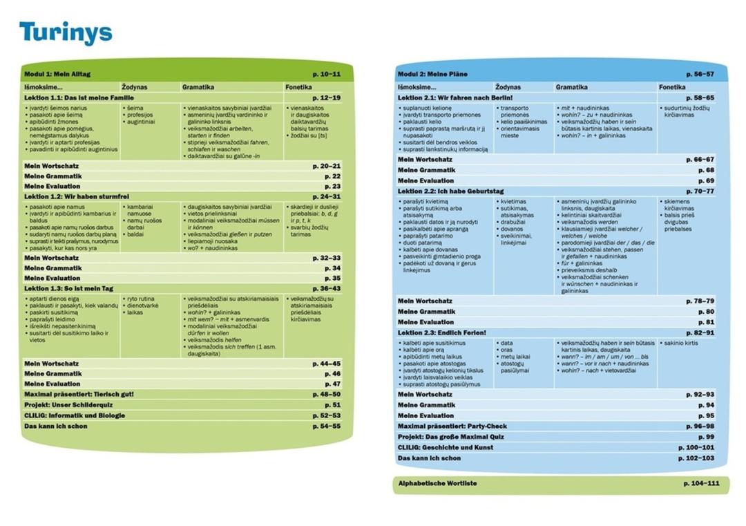 Kiekvienos temos pabaigoje pateikiamas aktualus vokiečių–lietuvių kalbų žodynėlis, padedantis lengviau įsisavinti naujus žodžius. Taip pat šiame vadovėlyje rasite gramatikos santraukas, vokiškai kalbančių valstybių bei Lietuvos krašto ir kultūros įdomybių skyrelius, integruoto vokiečių kalbos ir dalyko mokymo(si) skyrelius (CLILiG), testus savo pažangai įsivertinti.