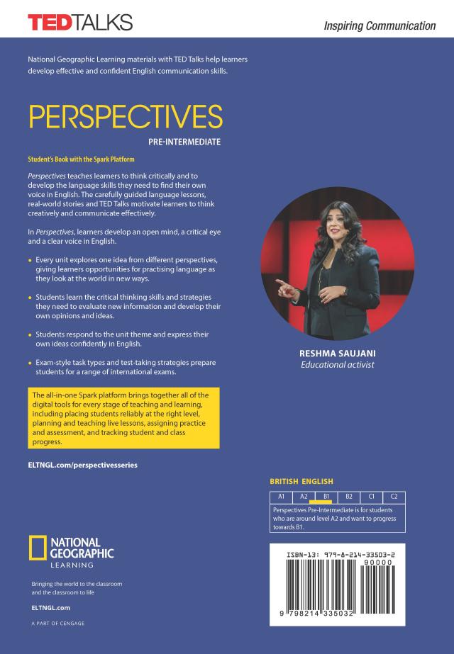 „PERSPECTIVES“ – tai modernus, turiningas kursas, kuris moko šiuolaikinius moksleivius mąstyti kritiškai bei lavinti visas keturias kalbines kompetencijas. Šis kursas skiria ypatingai daug dėmesio besimokančiųjų unikalios, savitos raiškos ir komunikacijos anglų kalba plėtojimui. Kruopščiai suplanuoti vadovėlio skyriai, tikros gyvenimiškos istorijos ir „TEDTalks“ konferencijų pranešimai motyvuoja besimokančiuosius kūrybiškai mąstyti ir efektyviai bendrauti tarpkultūriniame kontekste.